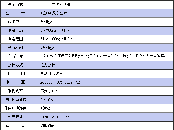 儀器符合GB/T7600;SH/T0246;GB/T606及采用卡爾—費休法測定樣品中水分的有關標準。儀器采用了先進的自動控制電路,電解電流自動跟蹤控制,外型結構新穎,從而使該儀器工作更可靠, 使用更方便,具有分析速度快(一分鐘出結果)、操作簡便、精度高、自動性強等特點, 同時具有自動打印功能,可將實驗結果、做樣時間、樣品編號自動打印出來, 廣泛應用于石油、化工、電力、鐵路、環(huán)保等部門。